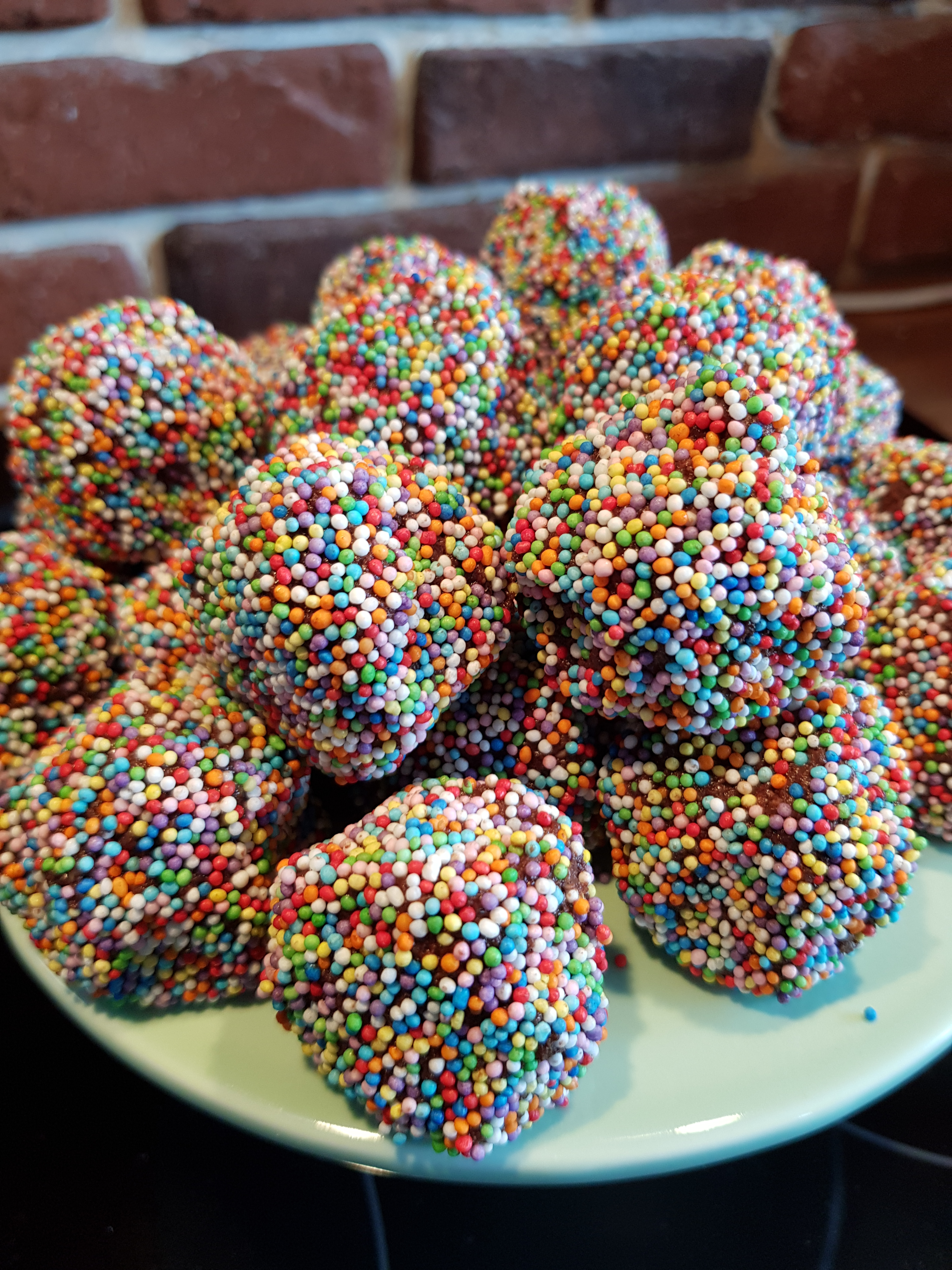 Rulla till bollar och lägg på en skärbräda. Rulla sen varje boll i valfritt strössel, om du vill ha extra mycket mintsmak rulla i polkaströssel.