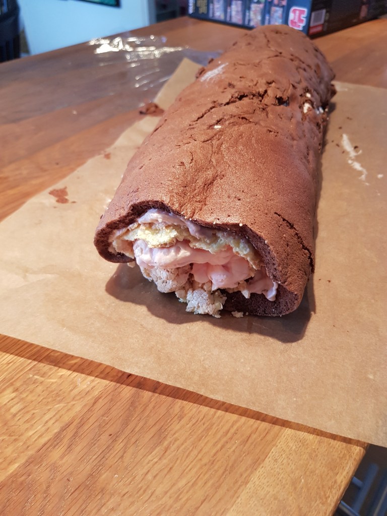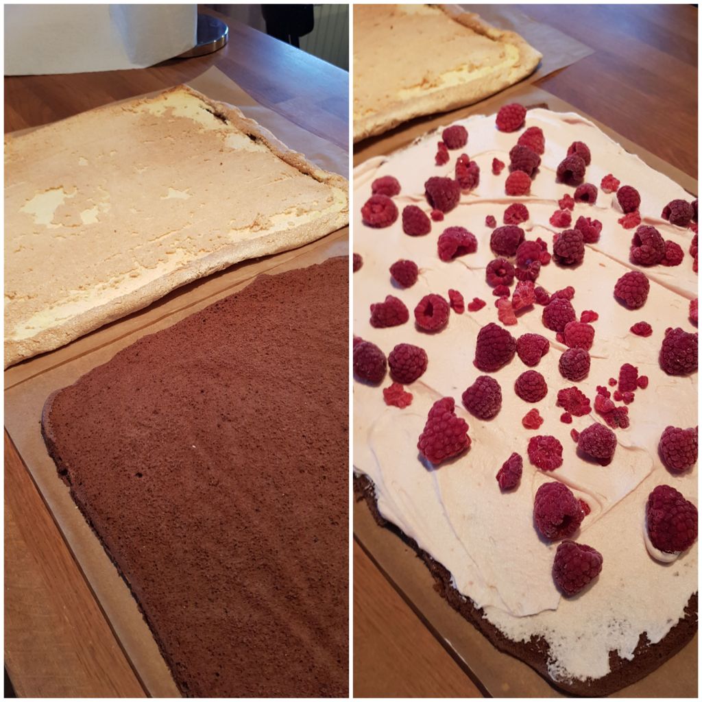 En rulltårta som har det mesta. Chokladbotten, seg maräng, mousse och syrliga hallon… värd att testa jag lovar! Det är många moment men dom tar inte så lång tid. Moussen kan man göra dagen innan, den behöver ju några timmar i kyl.