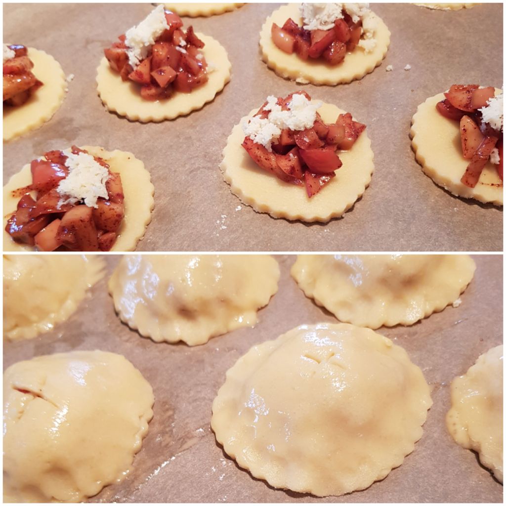 Lägg hälften av rundlarna på en plåt med bakplåtspapper. Fördela äppelkompotten ovanpå och lite riven mandelmassa. Lägg på locken och tryck till runt kanterna. Pensla med uppvispad äggula. Skär ett litet kryss i toppen.