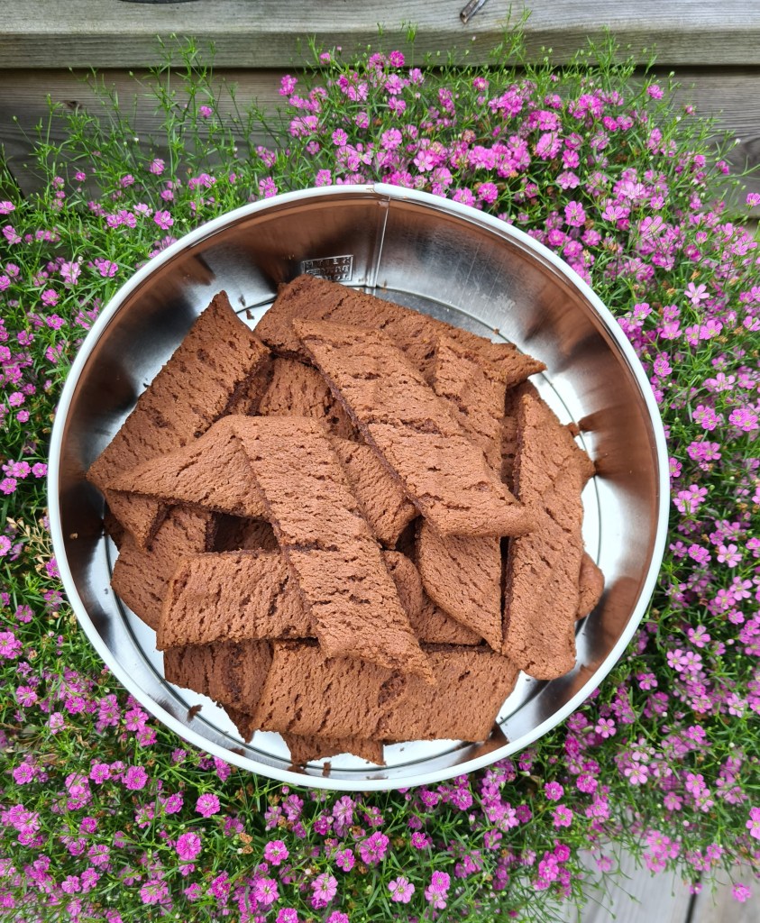 Grädda på 175 grader varmluft 10-12 minuter. Ta ut och dela varje längd i bitar. Låt svalna på plåten.