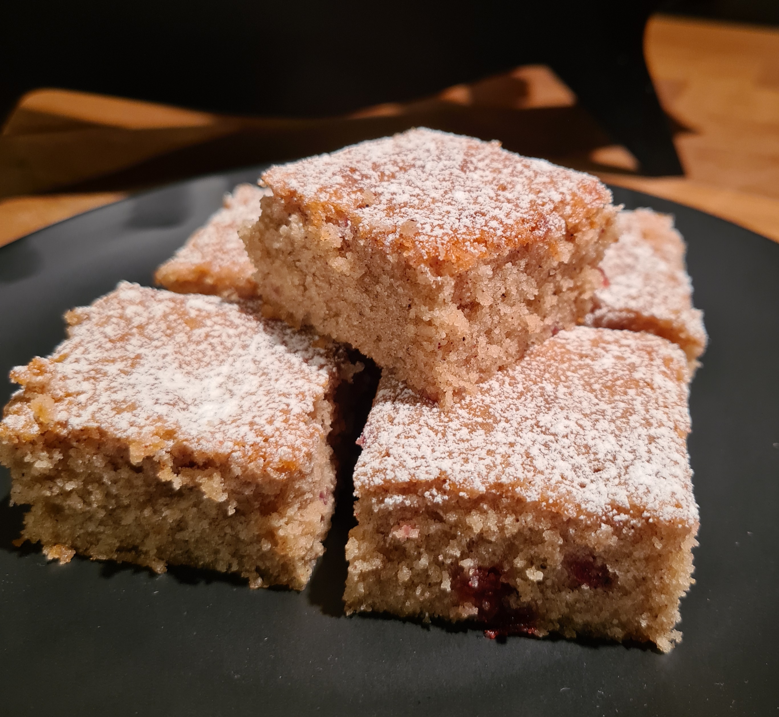 Ta ut och låt svalna. Dofta lite florsocker över och skär kakan i bitar.