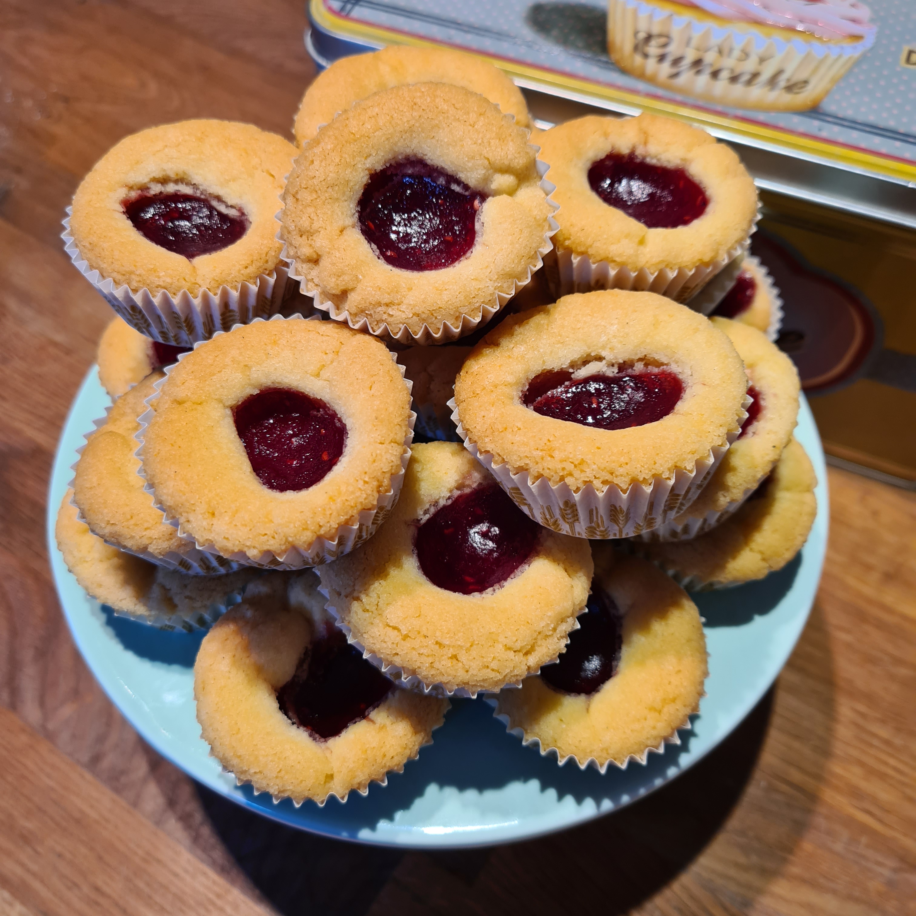 Dela upp degen i 24 delar, 25 g/del. Rulla till bollar och lägg i små kakformar.